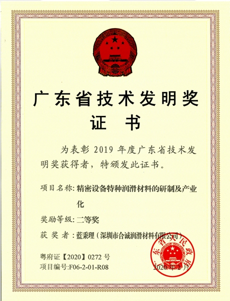 深圳市合誠(chéng)潤(rùn)滑材料有限公司“精密設(shè)備特種潤(rùn)滑材料的研制及產(chǎn)業(yè)化”項(xiàng)目榮獲廣東省人民政府批準(zhǔn)頒發(fā)2019年度廣東省科學(xué)技術(shù)獎(jiǎng)項(xiàng)——技術(shù)發(fā)明二等獎(jiǎng)。